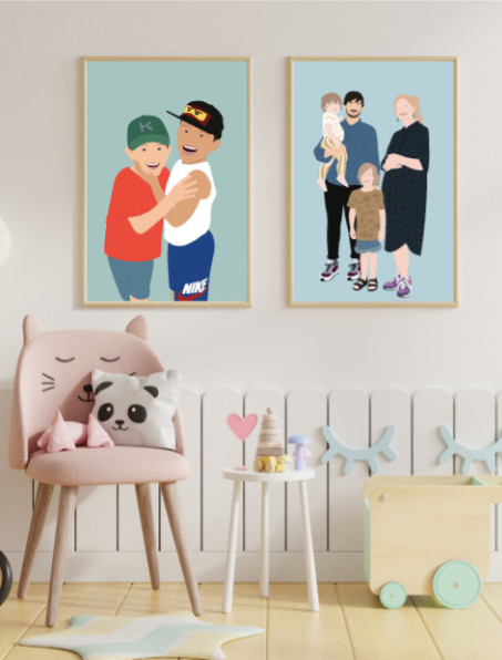 Charlotte et Cyriane, les deux artistes à l’origine de ce projet, sont spécialisées dans la création d’affiches personnalisées à prix doux. En gros, tu leur donnes une photo de ta famille, tes ami(e)s, ta/ton conjoint(e), ton chat ou ton village (liste non exhaustive), et elles t’en font une affiche que tu peux offrir ou accrocher dans ton salon.
